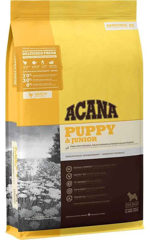 Acana Heirtage Puppy&Junior 11,4kg to bezzbożowa karma stworzona z myślą o szczeniętach oraz młodych psach ras średnich, ważących od 9 do 25 kg. Jej smak oparty na kurczaku sprawia, że jest niezwykle apetyczna. Może być również stosowana dla suk w ciąży oraz karmiących.