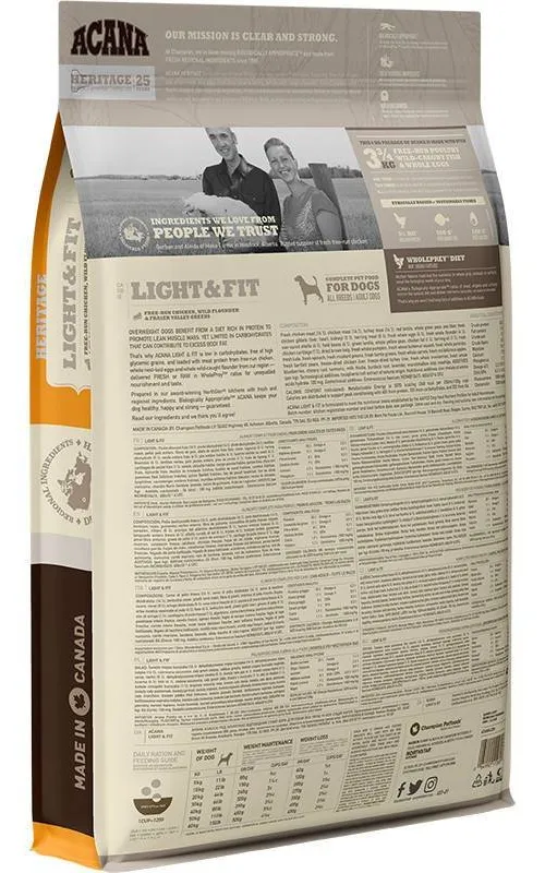 Acana Heritage Light & Fit Dog 6kg to karma stworzona specjalnie dla psów z nadwagą. Dzięki diecie bogatej w białko, Twój pies może osiągnąć zdrową masę mięśniową, jednocześnie kontrolując wagę. Formuła ta jest odpowiednia dla wszystkich ras i grup wiekowych. Zawiera 35% białka oraz ograniczoną ilość tłuszczu i kalorii, co wspiera maksymalną sprawność fizyczną.