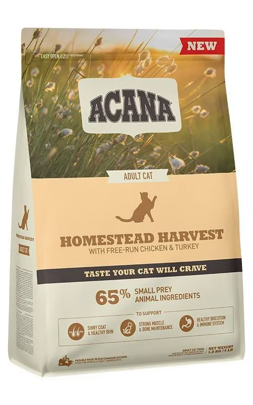 Acana Homestead Harvest Cat 1,8kg to karma sucha stworzona z myślą o dorosłych kotach wszystkich ras. Jej skład oparty jest na kurczaku i indyku z wolnych wybiegów, co przyczynia się do wsparcia odporności oraz zdrowia serca i wzroku Twojego pupila.