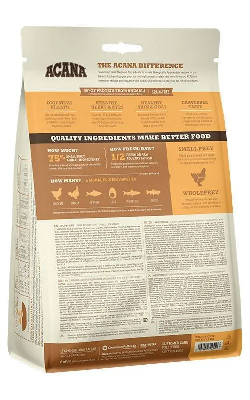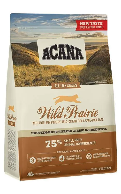 Acana Wild Prairie Cat 1,8kg to bezzbożowa karma stworzona z myślą o kotach w każdym wieku. Dzięki wysokiej zawartości białka pochodzenia zwierzęcego, dostarcza niezbędnych składników odżywczych, wspierając zdrowy układ pokarmowy, serce oraz kondycję sierści i skóry.