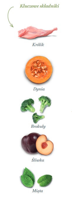 Skład: świeżo przygotowany królik 68%, zielony groszek, białko grochu, ziemniak, błonnik jabłkowy, drożdże, minerały, olej z kurczaka, tapioka, nasiona lnu, olej rybny, psyllium, jarmuż, kryl antarktyczny, wodorosty, spirulina, dynia, brokuły, śliwki, cykoria, ekstrakt z mandarynki, imbir, rozmaryn, yucca schidigera.