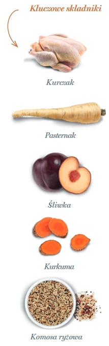 świeżo przygotowany kurczak 71%, cały zielony groszek, brązowy ryż, hydrolizat wątroby kurczaka, drożdże, białko grochu, tapioka, błonnik jabłkowy, minerały, olej rybny, olej z kurczaka, psyllium, odwodniona dynia, kryl antarktyczny, wodorosty, spirulina, komosa ryżowa, biała marchew, odwodniony jarmuż, odwodnione śliwki, cykoria, hydrolizowana ściana komórkowa drożdży, ekstrakt z mandarynki, kurkuma, imbir, yucca schidigera, rozmaryn.