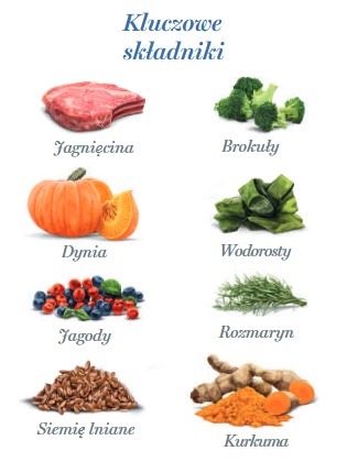 jagnięcina 85% (w tym 60% świeża jagnięcina, 25% bulion jagnięcy), dynia 5%, białko ziemniaczane, ziemniaki 2%, żurawina, minerały, olej słonecznikowy, siemię lniane 0,03%, inulina 0,02%, hydrolizowana ściana komórkowa drożdży 0,02%, chondroityna 200 mg/kg, brokuły 100 mg/kg, wodorosty morskie 100 mg/kg, rozmaryn 100 mg/kg, kurkuma 100 mg/kg.