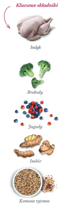 Karma oparta jest na indyku, co czyni ją doskonałym wyborem dla psów z wrażliwym układem pokarmowym oraz skłonnościami do nadwagi. Lekkostrawne węglowodany, takie jak brązowy ryż, dostarczają energii bez ryzyka podrażnień trawiennych.