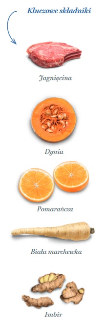 Świeżo przygotowana jagnięcina 65%, odwodniony ziemniak, cały zielony groszek, błonnik jabłkowy, olej z kurczaka, hydrolizat wątroby jagnięcej, minerały, drożdże, nasiona lnu, olej rybny, glukozamina, odwodniona dynia, odwodnione brokuły, odwodniony jarmuż, kryl antarktyczny, wodorosty kelp, żurawina, spirulina, imbir, biała marchew, cykoria, chondroityna, odwodniona pomarańcza, rozmaryn, yucca schidigera.