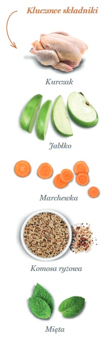 Skład: świeżo przygotowany kurczak 71%, cały zielony groszek, brązowy ryż, hydrolizat wątroby kurczaka, białko ryżowe, błonnik jabłkowy, minerały, drożdże, olej rybny, olej z kurczaka, glukozamina, odwodniona dynia, odwodnione brokuły, odwodniony jarmuż, kryl antarktyczny, wodorosty kelp, żurawina, spirulina, komosa ryżowa, odwodniona marchew, cykoria, chondroityna, imbir, mięta, rozmaryn, yucca schidigera.
