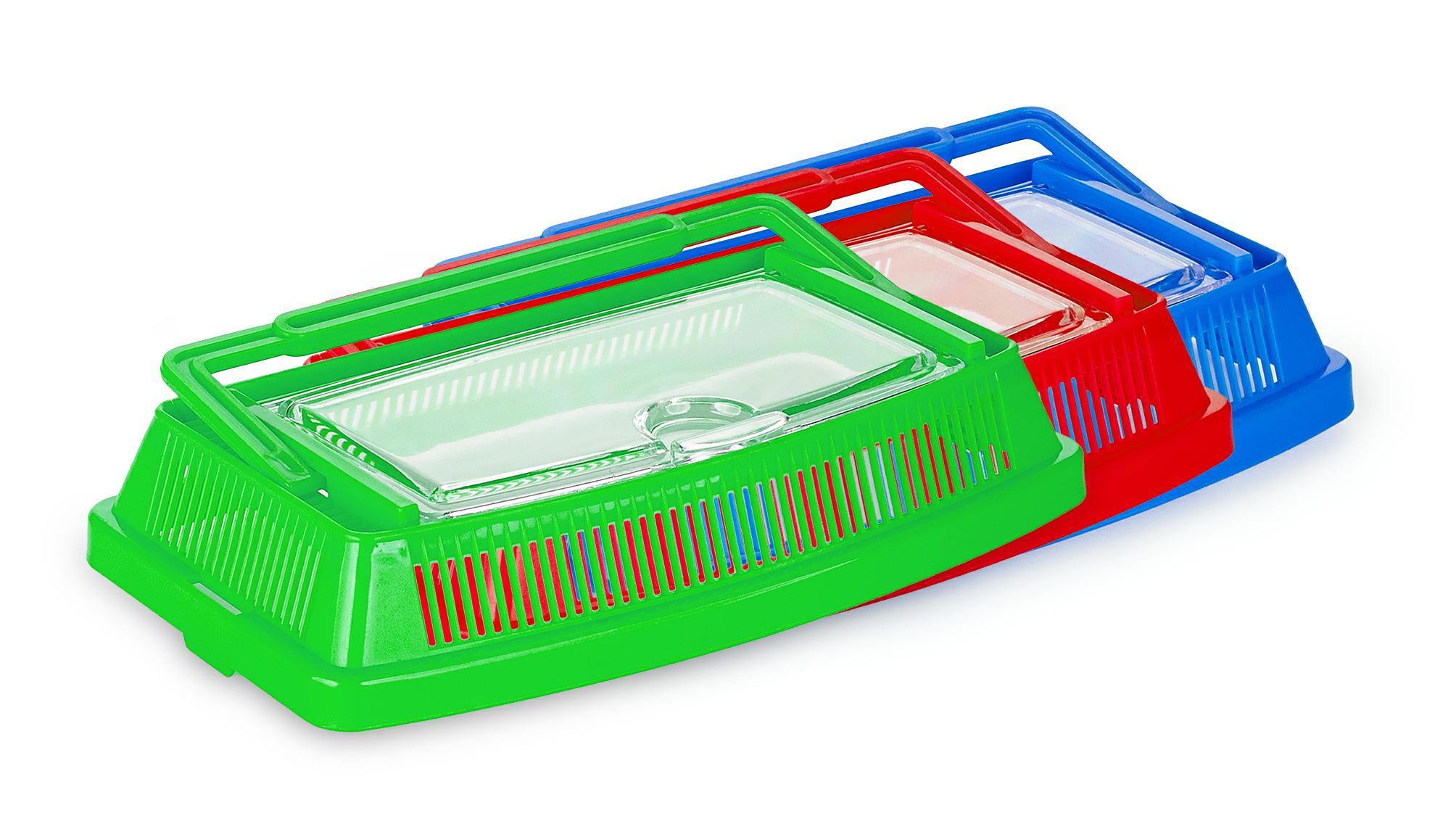 Ten plastikowy pojemnik wyposażony jest w zaokrągloną przednią szybę oraz otwory wentylacyjne, które zapewniają stałą wymianę gazową. Dodatkowo, wygodny uchwyt ułatwia przenoszenie.