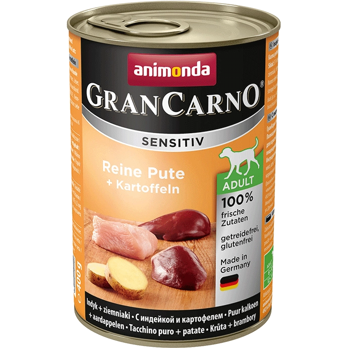 Animonda GranCarno Sensitiv Adult Dog Indyk I Ziemniaki 400g to idealna karma dla dorosłych psów o wrażliwych żołądkach. Dzięki braku zbóż, soi i glutenu, stanowi doskonały wybór dla psów cierpiących na nietolerancję pokarmową. W składzie znajdziesz 55% indyka, co zapewnia naturalny i mięsny smak, a dodatkowo lekkostrawne ziemniaki, które wspierają zdrową dietę.