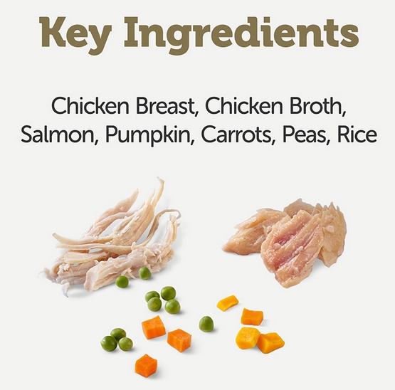 Składniki: Pierś z Kurczaka 28%, Łosoś 17%, Dynia 8%, Marchewka 8%, Zielony Groszek 8%, Ryż 5%, Rosół z Kury 26%.