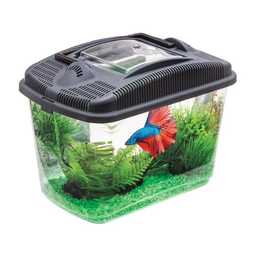 Akwarium dla bojownika, bezpieczna alternatywa kuli, klasyczny kształt ułatwiający obserwację ryby. Zdejmowana pokrywa chroniąca przed wyskoczeniem ryby, otwory w pokrywie dla dostępu powietrza atmosferycznego. Funkcjonalna, otwierana klapka do karmienia ryby, praktyczny uchwyt ułatwiający przenoszenie akwaria.