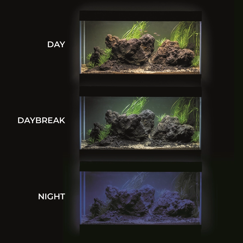 Moduł działa w trzech trybach: DAY, DAYBREAK i NIGHT. Tryb DAY to podstawowe, najjaśniejsze światło do oświetlania akwarium w ciągu dnia. DAYBREAK zmniejsza moc oświetlenia dziennego do 50% oraz dodaje niebieskie światło, co jest idealne podczas karmienia ryb. Tryb NIGHT zapewnia niebieską poświatę, umożliwiając unikalną obserwację akwarium po zmroku.