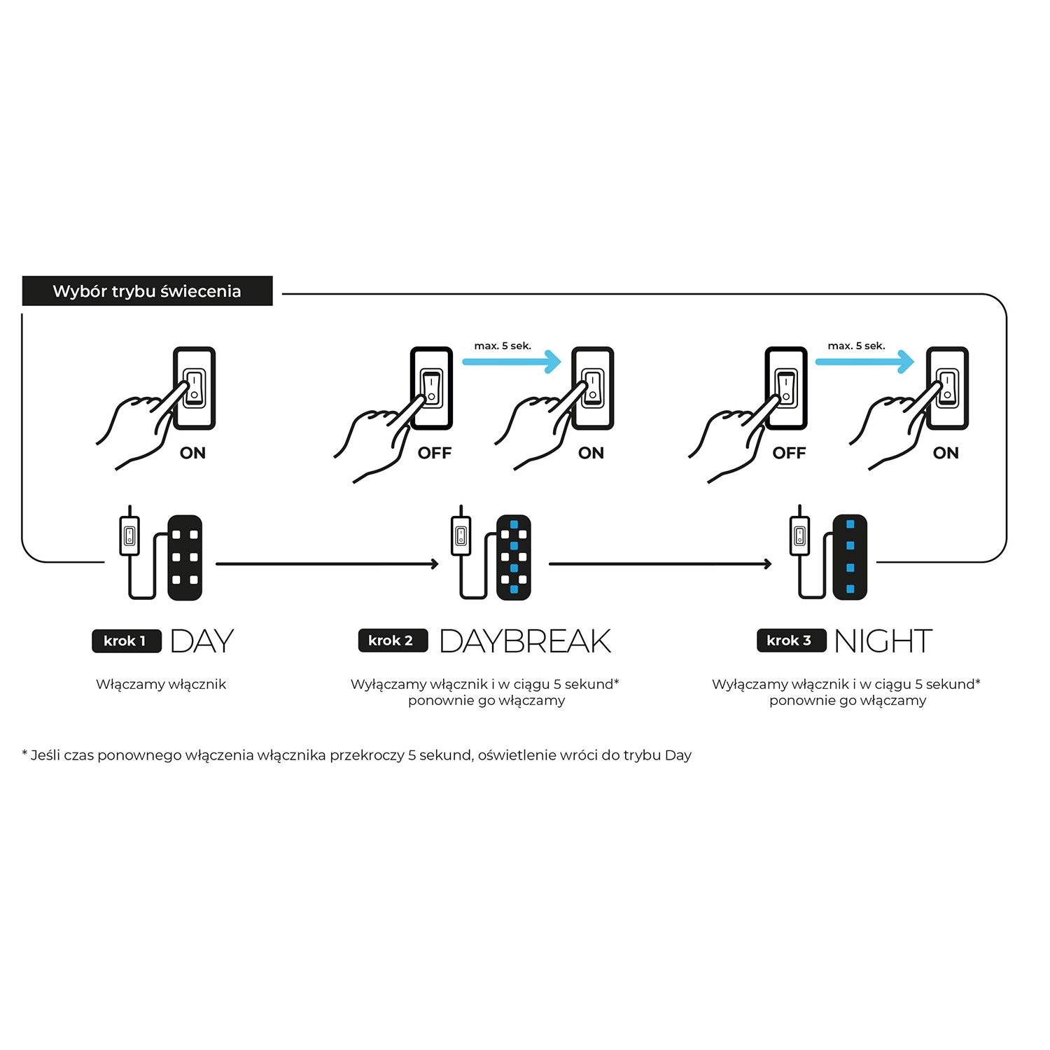 Moduł działa w trzech trybach: DAY, DAYBREAK oraz NIGHT. Tryb DAY to najsilniejsze światło do oświetlenia akwarium w ciągu dnia. DAYBREAK to delikatniejsze światło, idealne do karmienia ryb, a NIGHT to niebieska poświata, która umożliwia obserwację nocnych mieszkańców akwarium.