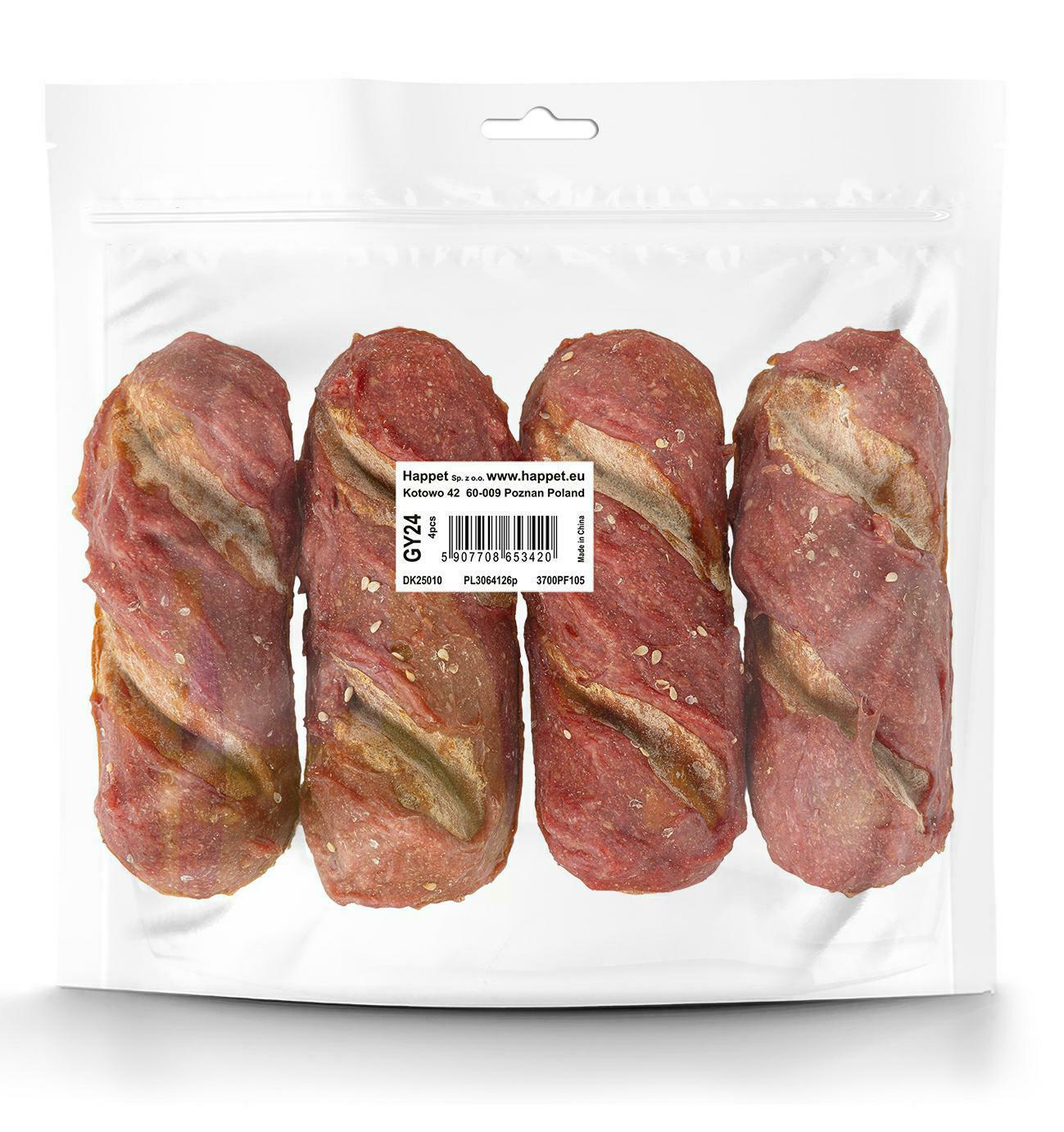 W opakowaniu znajdziesz cztery sztuki tych smakołyków, wykonanych z mięsa jagnięcego (22%) oraz surowej skóry (73,5%). Dodatkowo, produkt wzbogacony jest o sezam oraz inne składniki wspierające trawienie, co czyni go doskonałym wyborem dla psów.
