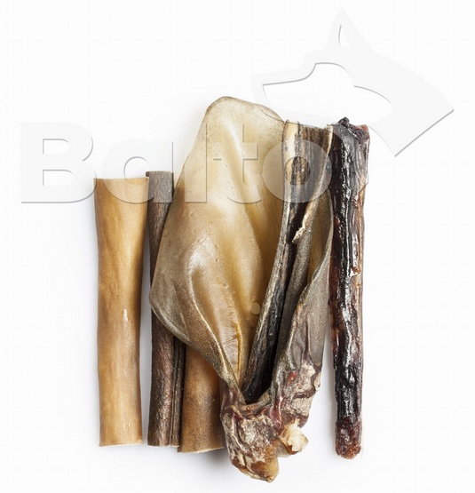 Oferujemy zestaw naturalnych gryzaków, które zaspokoją potrzebę żucia Twojego psa. W składzie znajdują się mix skór, ucha wołowego oraz ogonków wołowych. Dzięki twardym gryzakom, zestaw idealnie sprawdzi się dla szczeniaków oraz małych i średnich psów, które intensywnie żują. Nawet jeśli pies zjada szybko, kawałki namiękną w żołądku, co czyni je bezpiecznymi.