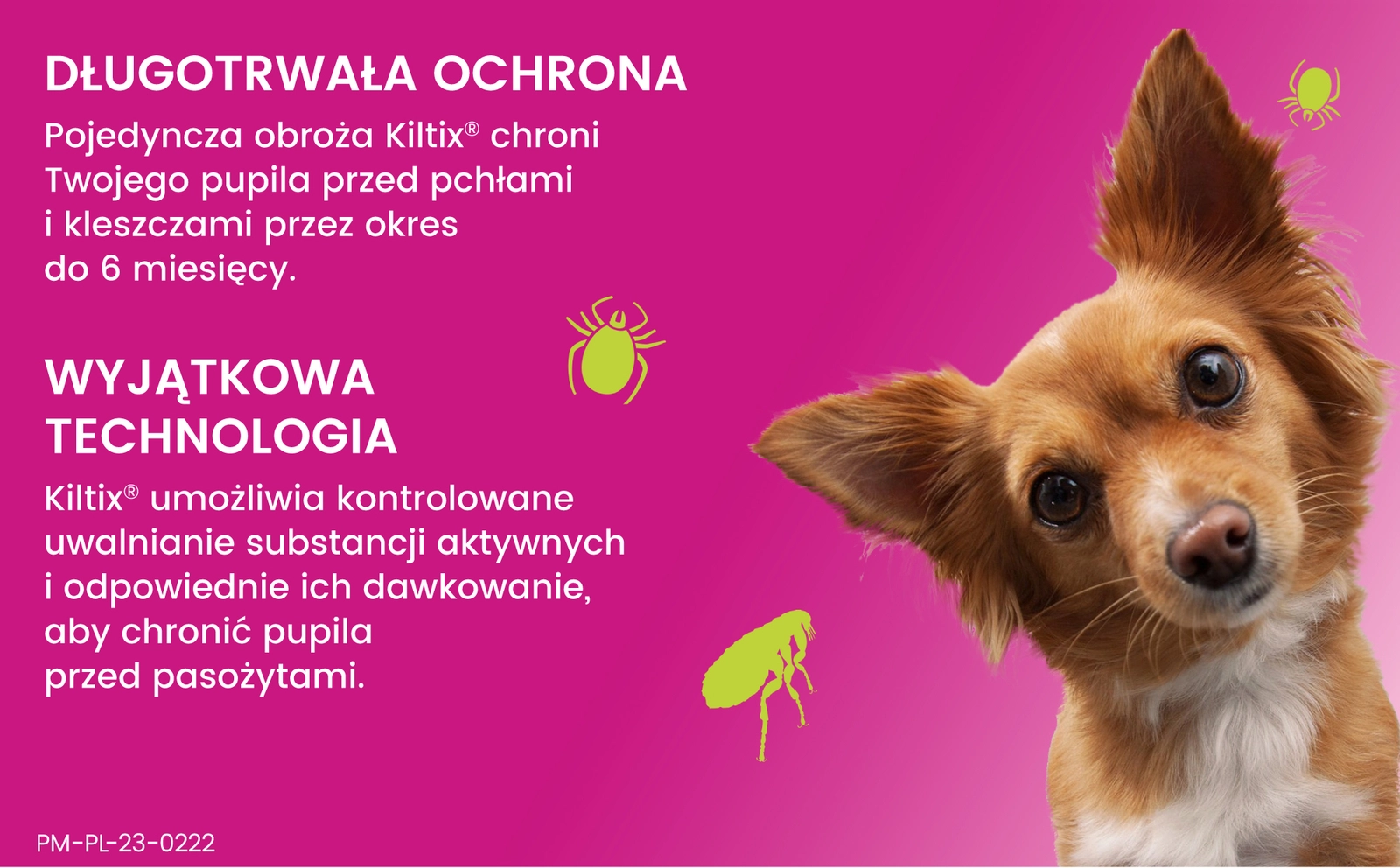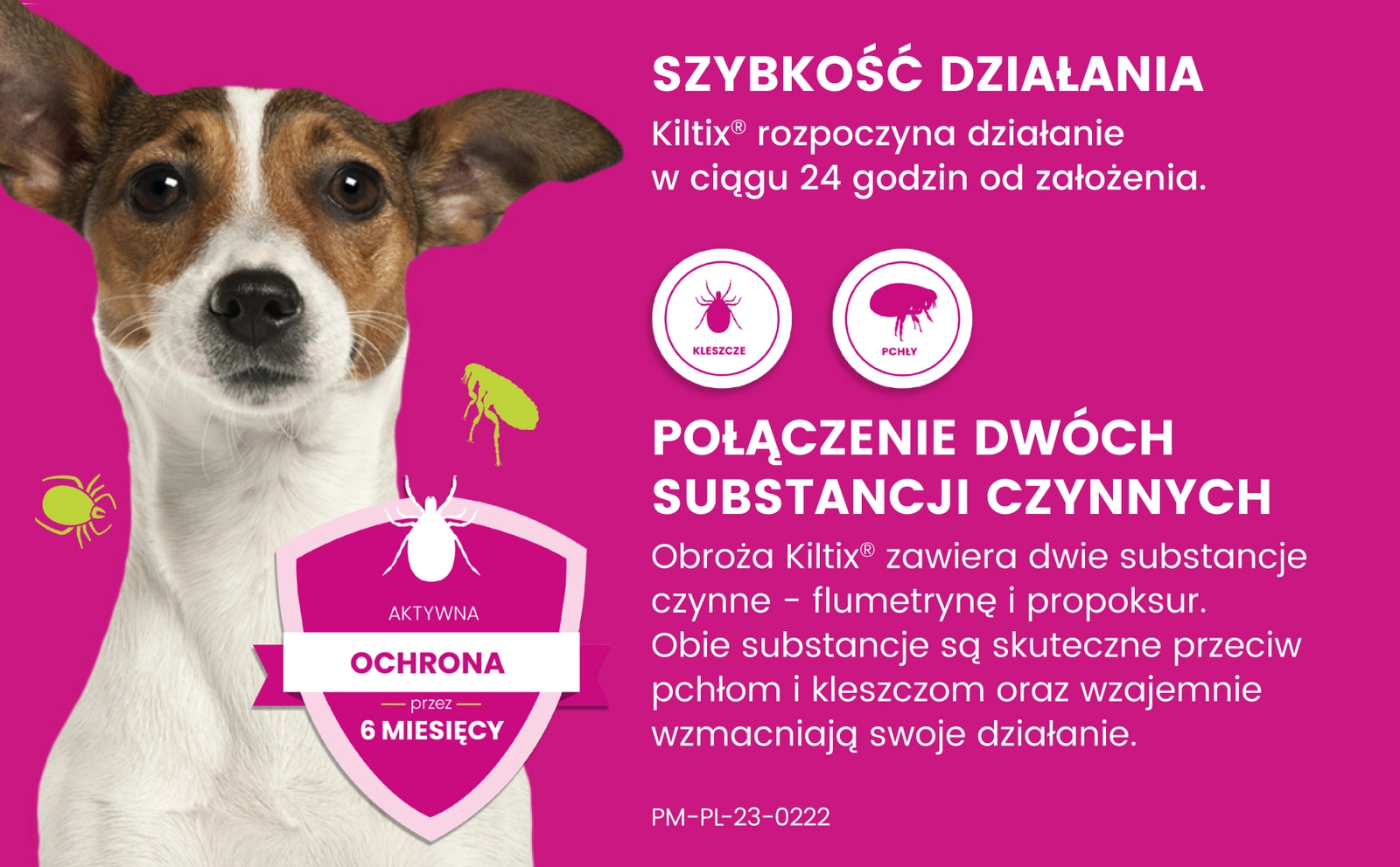 Obroża Kiltix to sprawdzony sposób na zabezpieczenie pupila przed nieprzyjemnymi inwazjami kleszczy i pcheł. W przypadku dalszych pytań lub wątpliwości, zaleca się konsultację z weterynarzem.