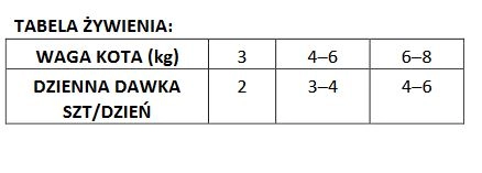 Zalecana dawka dobowa jest podana w tabeli, ale może się różnić w zależności od wieku, aktywności oraz środowiska kota. Zawsze zapewniaj dostęp do świeżej wody. Karmę podawaj w temperaturze pokojowej, a po otwarciu przechowuj w lodówce.