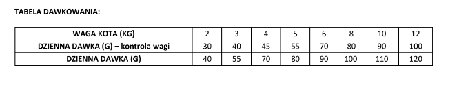 Stosowanie: zaleca się podawać suchą karmę lub zwilżoną letnią wodą. Dawkowanie jest uzależnione od wagi kota, a dzienną porcję należy podzielić na mniejsze posiłki.