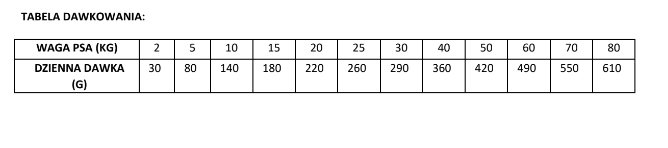 Zapewnij psu stały dostęp do świeżej wody. Karma może być podawana na sucho lub po zwilżeniu ciepłą wodą. W przypadku wystąpienia objawów nietolerancji, zaleca się stosowanie przez 3-8 tygodni. W razie potrzeby skonsultuj się z weterynarzem.