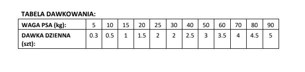 Ze względu na wysoką smakowitość należy stosować się do zaleceń dziennego dawkowania i codziennie ćwiczyć z psem.