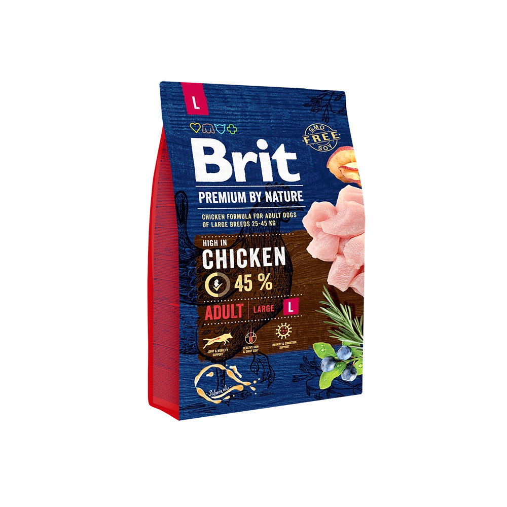 Brit Premium By Nature Adult L to pełnoporcjowa karma dla dorosłych psów dużych ras, ważących od 25 do 45 kg. Dzięki zawartości 45% kurczaka, zapewnia doskonałe źródło białka, które wspiera zdrowie i kondycję Twojego pupila.