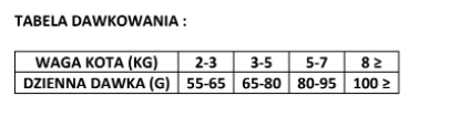 Skład: dehydratyzowany kurczak 38%, ryż, tłuszcz z kurczaka, groch, suszona pulpa jabłkowa, psyllium, drożdże piwne, hydrolizowana wątroba z kurczaka 2%, olej z łososia 1%, suszony szpinak 0,5%, mannanooligosacharydy (150 mg/kg), fruktooligosacharydy (120 mg/kg), Jukka Mojave (80 mg/kg), suszony rozmaryn (11 mg/kg), suszone goździki (11 mg/kg), suszone cytrusy (11 mg/kg), suszona kurkuma (11 mg/kg).