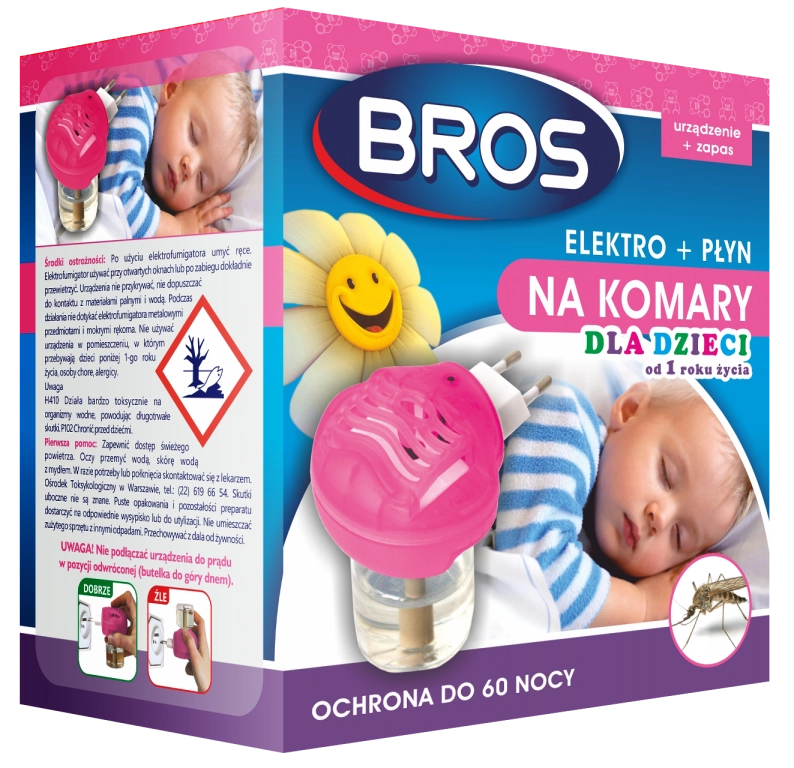 Bros na komary dla dzieci Elektrofumigator z płynem do zwalczania komarów i zabezpieczania pomieszczeń przed owadami nadlatującymi z zewnątrz. Działa nawet przy otwartych oknach i włączonym świetle. Estetyczne, kolorowe urządzenia dobrze pasuje do kolorystyki dziecięcych pokoi. Urządzenie BROS zabezpiecza pomieszczenie do 20 m2 (ok. 50 m3) przez 60 nocy przy stosowaniu 8 h na dobę. Optymalną ochronę uzyskuje się po 30 min. od włączenia.