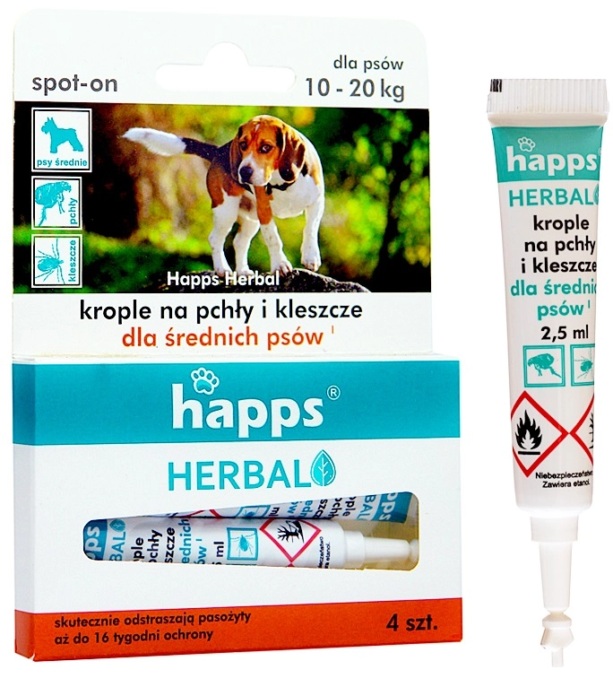 Wygodne i łatwe w użyciu krople HAPPS HERBAL to preparat do odstraszania pcheł i kleszczy, który aplikuje się bezpośrednio na skórę psa. Może być stosowany zarówno u dorosłych zwierząt, jak i u szczeniąt powyżej 12 tygodnia życia. 4 aplikacje zapewniają ochronę do 16 tygodni. Środek na pasożyty Happs może być stosowany zarówno u dorosłych zwierząt, jak i u szczeniąt powyżej 12 tygodnia życia.