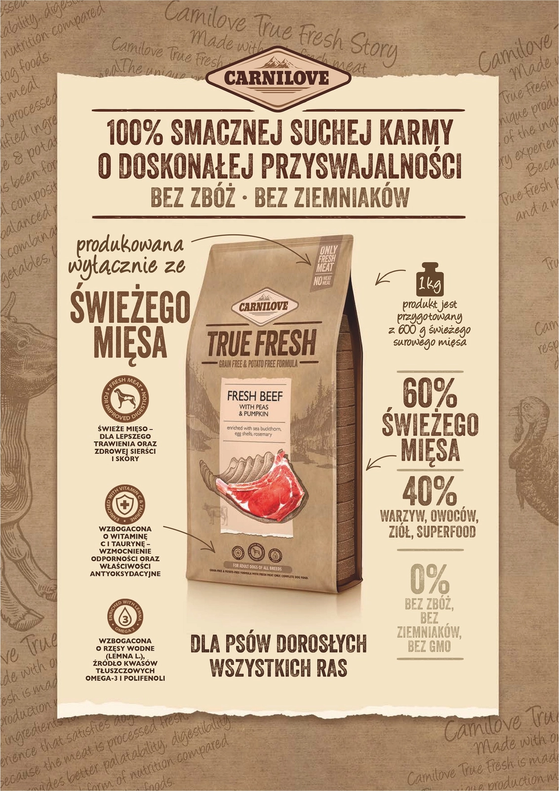 Carnilove True Fresh Beef 11,4kg to pełnoporcjowa karma dla psów dorosłych wszystkich ras, oparta na świeżej wołowinie, grochu i dyni. Dzięki starannie dobranym składnikom, wspiera zdrowie Twojego pupila. Wołowina pochodzi z lokalnych gospodarstw, co zapewnia jej wysoką jakość. Karma jest wolna od zbóż i ziemniaków, co sprawia, że jest odpowiednia dla psów z wrażliwym układem pokarmowym.