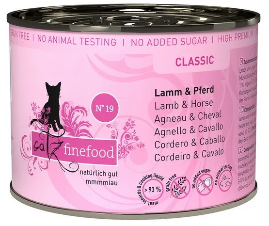 Karma Catz Finefood Classic N.19 to doskonały wybór dla kotów. W składzie znajdziesz aż 50% delikatnej jagnięciny oraz 20% koniny, co zapewnia odpowiednią ilość białka. Dodatkowe składniki, takie jak pomidory, imbir i cukinia, wzbogacają dietę Twojego pupila. Produkt nie zawiera konserwantów, barwników ani wzmacniaczy smaku, a także jest wolny od GMO.