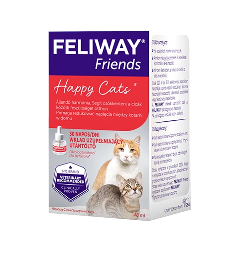 FELIWAY Friends to łatwe w użyciu rozwiązanie łagodzące konflikty pomiędzy kotami mieszkającymi pod jednym dachem i pozwalające uniknąć oznak stresu: walczenia, pogoni, blokowania, wpatrywania się.