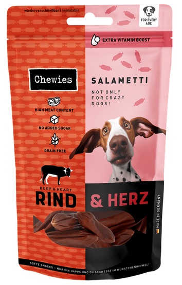 Chewies SALAMETTI są wolne od zbóż i cukru, a ich produkcja odbywa się w Niemczech, bez dodatku GMO i testów na zwierzętach. Dzięki temu możesz mieć pewność, że podajesz swojemu psu tylko to, co najlepsze.