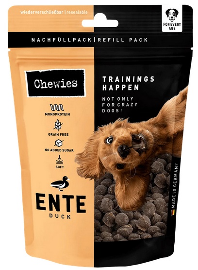 Te lekkostrawne kąski mają około 1 cm wysokości i są grube, co ułatwia ich podawanie jako nagrody. Chewies Trainings-Happen nie zawierają wzmacniaczy smaku, zbóż ani cukru, co czyni je odpowiednimi dla psów z alergiami pokarmowymi.