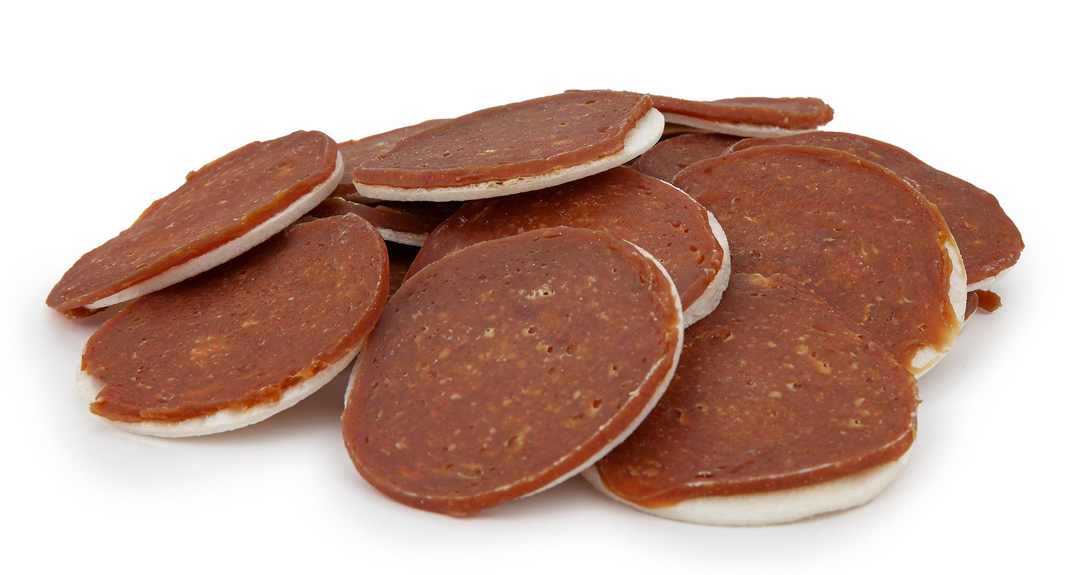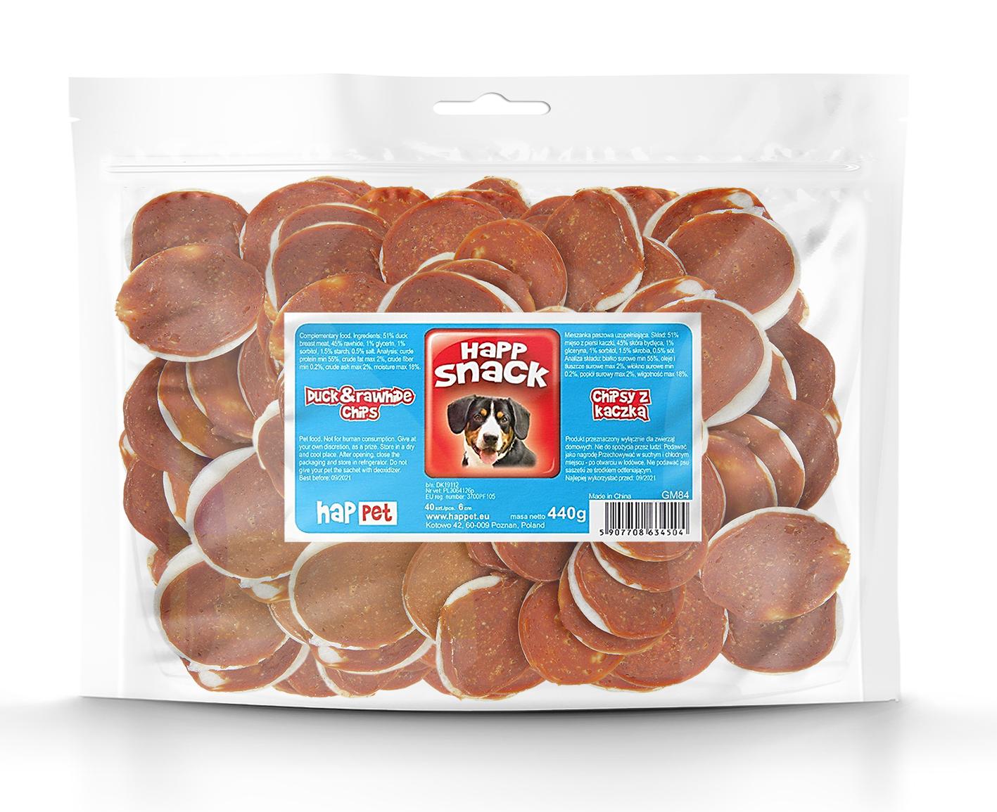 Oferujemy pyszne chipsy z kaczką, które stanowią doskonałą przekąskę dla Twojego psa. Wykonane z białych, prasowanych krążków ze skóry wołowej, obłożonych mięsem z piersi kaczki, są nie tylko smaczne, ale również zdrowe.