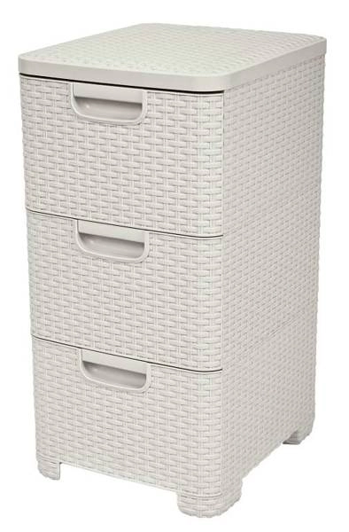 Praktyczny regał o nowoczesnym designie przyda się w każdym domu. Posiada trzy pojemne szuflady, które są wytrzymałe i co najważniejsze bardzo łatwe w czyszczeniu. Każda z nich posiada uchwyt, nie wystający poza obręb kosza. Wysokiej jakości materiał, z którego jest zrobiony przypomina w swojej strukturze popularny rattan, który idealnie wpisuje się w każdy wystrój wnętrz.