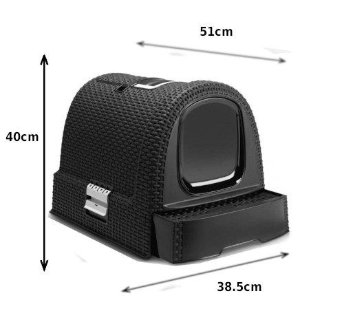 Wymiary toalety to 51 x 38,5 x 40 cm, co czyni ją odpowiednią dla większości kotów. Kolor grafitowo-szary sprawia, że będzie pasować do każdego wnętrza. Zamknięta konstrukcja oraz przyciemnione drzwi wahadłowe zapewniają prywatność Twojemu pupilowi, a jednocześnie ułatwiają utrzymanie czystości.