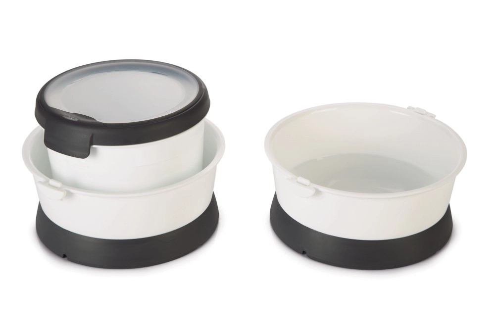 Podręczny zestaw Curver przeznaczony do przenoszenia i serwowania karmy Twojemu psu lub kotu w czasie podróży. Zestaw składa się z plastikowego pojemnika na karmę oraz dwóch plastikowych misek, idealnych do podawania pożywienia lub wody podczas wycieczki. Złożony zestaw tworzy poręczną i lekką tubę z dołączonym uchwytem ułatwiającym przenoszenie.