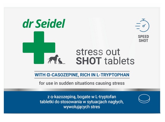 Preparat DermaPharm Stress Out Shot to tabletki, które zawierają naturalne składniki, takie jak alfa-kazozepina, L-tryptofan oraz witaminy z grupy B. Są one idealne w sytuacjach wywołujących stres u zwierząt, jak wizyty u weterynarza, burze czy podróże. Dzięki nim Twoje zwierzę może szybciej osiągnąć stan relaksacji.
