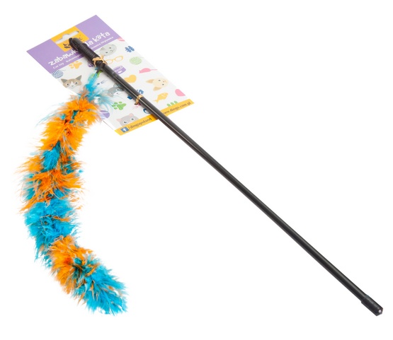 Wędka zakończona jest kolorowym ogonem z piór, który przyciąga uwagę kota i zachęca go do zabawy. Wymiary produktu to długość ogona wynosząca 26 cm oraz długość uchwytu 47 cm, co zapewnia komfort podczas zabawy.