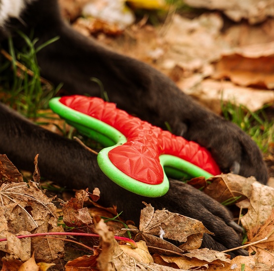 Zabawka ma wysokość 16,5 cm i występuje w atrakcyjnych kolorach: czerwonym z zielonym spodem. Jej różnorodna struktura przyciąga uwagę psa i wspomaga higienę zębów.