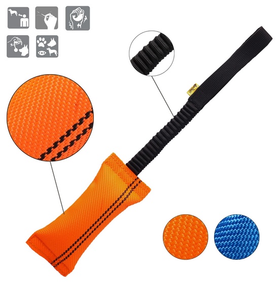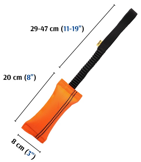 Szarpak wyposażony jest w mocny uchwyt z amortyzowaną rączką bungee, co ułatwia opiekunowi trzymanie zabawki podczas zabawy. Dzięki temu pies może w pełni korzystać z możliwości szarpaka, ucząc się odpowiedniego gryzienia oraz rozładowując emocje.
