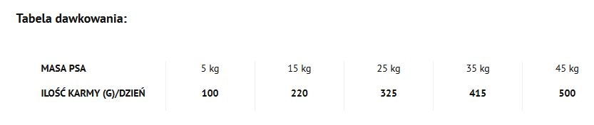 | Ilość karmy (g/dzień) | 100 | 220 | 325 | 415 | 500 |