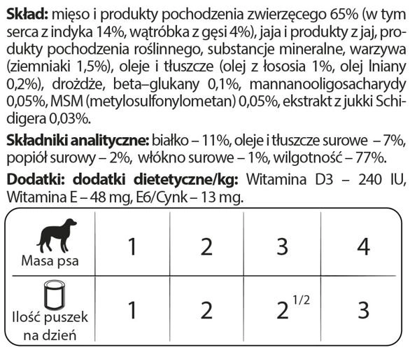Karma stworzona z myślą o szczeniętach i młodych psach małych ras. Zawiera serca z indyka oraz wątróbkę z gęsi, co wspiera zdrowy rozwój Twojego pupila. W składzie znajdują się witaminy B2, B3, B6 oraz minerały, takie jak selen, cynk i potas. Dzięki wysokiej zawartości mięsa z indyka i gęsi, karma jest bogata w nienasycone kwasy tłuszczowe n–6, co korzystnie wpływa na kondycję skóry i wygląd sierści.