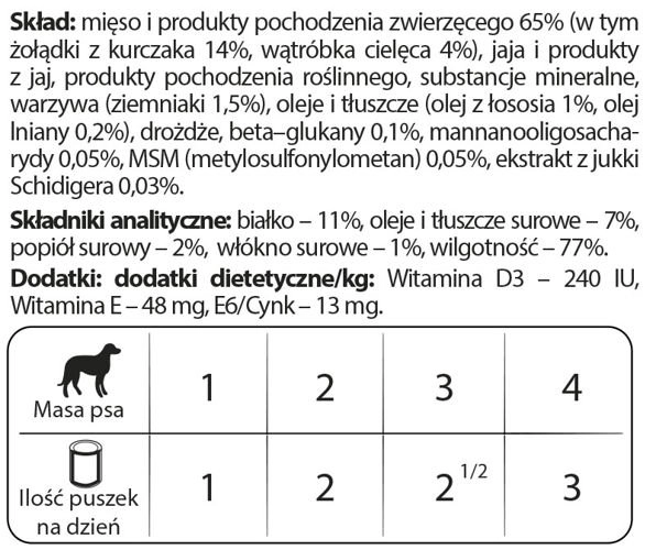 Pełnoporcjowa karma stworzona z myślą o szczeniętach i młodych psach małych ras. Bogata w żołądki z kurczaka oraz wątróbkę cielęcą, dostarcza cennych aminokwasów, które wspierają prawidłowy rozwój. Kurczak i cielęcina są źródłem żelaza, selenu, miedzi i cynku, co wpływa na zdrową skórę, lśniącą sierść oraz wysoką odporność. Dodatkowo, karma wzbogacona jest w witaminę B12 z mięsa kurczaka oraz witaminę B6 i potas z ziemniaków, co korzystnie wpływa na układ pokarmowy.