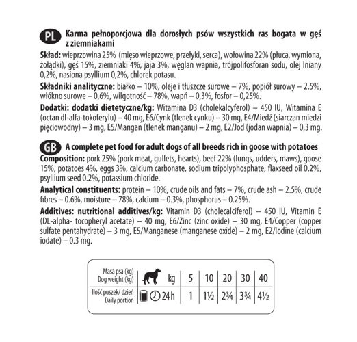 Dolina Noteci Premium Gęś Z Ziemniakami 150g to pełnoporcjowa karma dla dorosłych psów wszystkich ras. Dzięki zawartości gęsiny i ziemniaków, dostarcza niezbędnych aminokwasów oraz składników mineralnych, takich jak żelazo i selen, które wspierają prawidłowe funkcje organizmu. Gęsina jest źródłem zdrowych kwasów tłuszczowych, a dodatek ziemniaków zapewnia łatwo przyswajalne węglowodany.