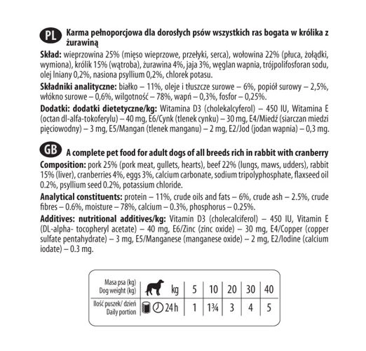 Karma pełnoporcjowa dla dorosłych psów wszystkich ras, wzbogacona królikiem i żurawiną. Ta wyjątkowa receptura dostarcza cennych aminokwasów, w tym lizyny i fenyloalaniny. Dzięki wysokiej zawartości lizyny, mięso królika wspiera organizm w wielu procesach. Dodatkowo, selen i żelazo zawarte w karmie stymulują funkcje obronne ciała. Owoce żurawiny oraz nasiona babki płesznik wspomagają prawidłowe trawienie i regularność wypróżnień.