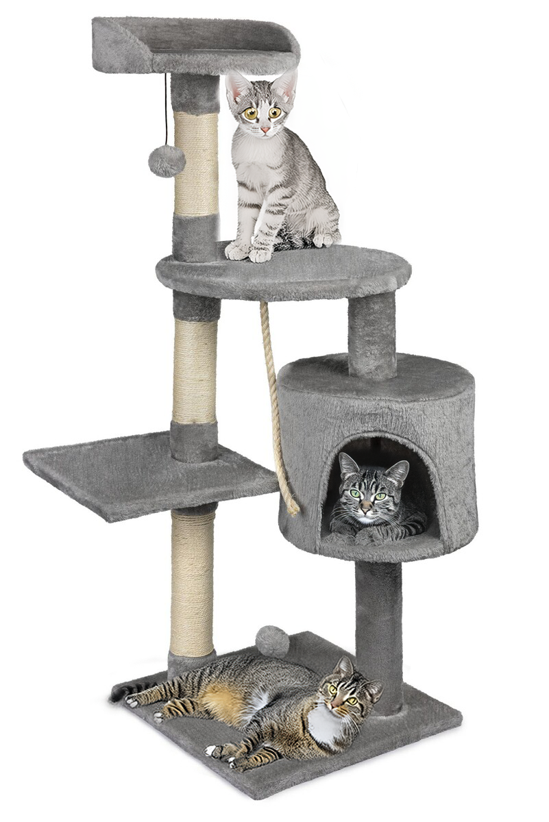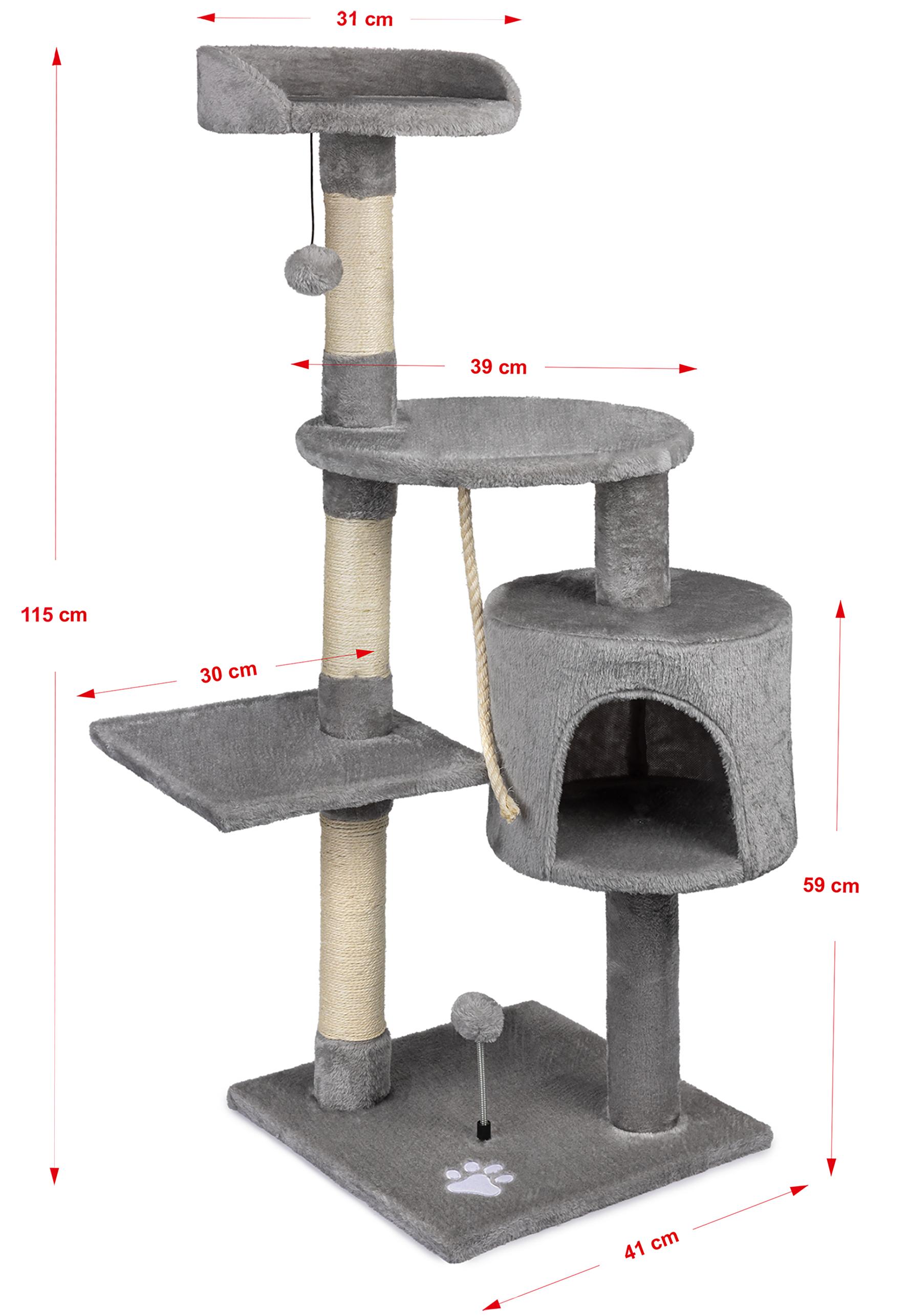 Model o wysokości 115 cm łączy w sobie przytulne miejsce do wypoczynku oraz świetną zabawę. Jego wolnostojąca konstrukcja została wykonana z ramy owiniętej dwukolorowym pluszem oraz sizalową liną, co zapewnia trwałość i komfort. Dodatkowo, drapak posiada domek, w którym kot może schować się i odpocząć w spokoju.