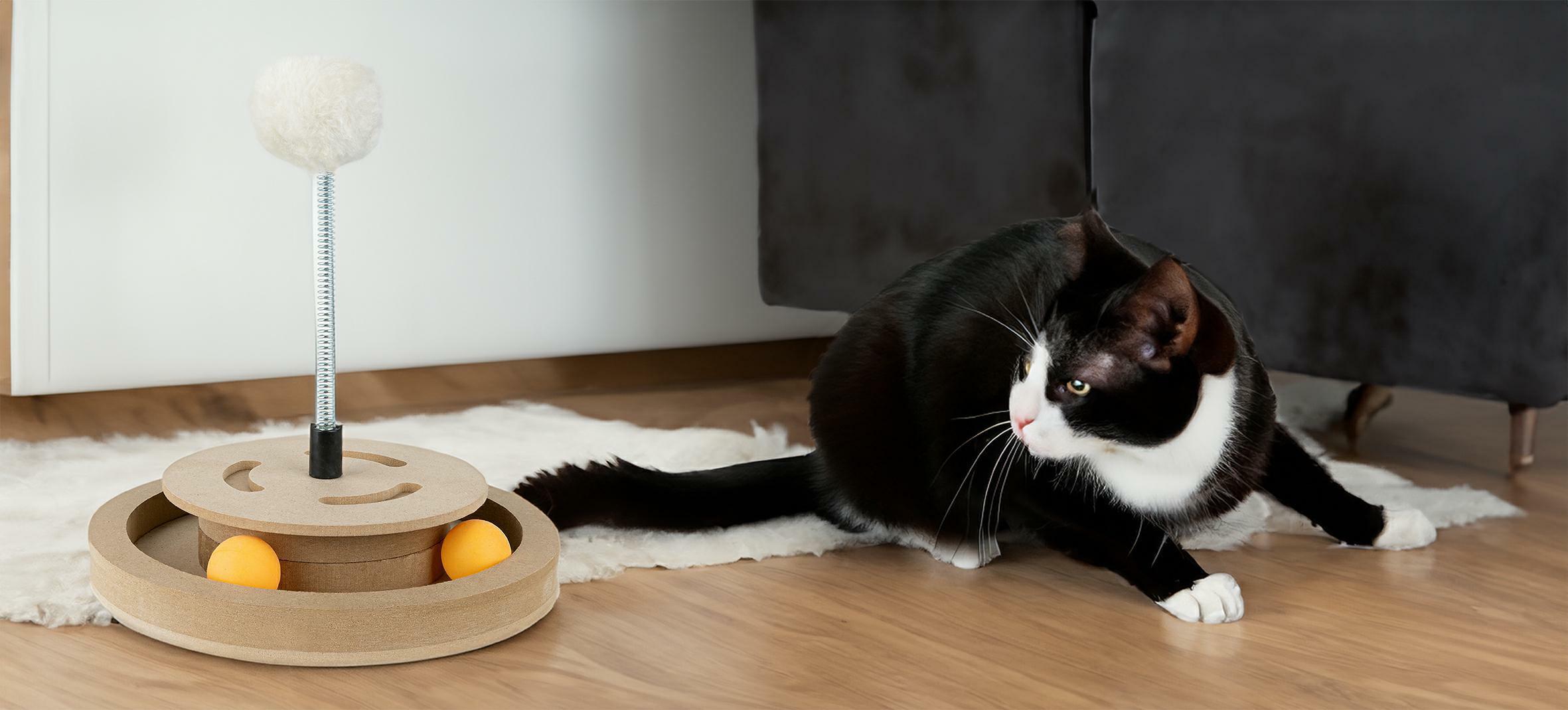 Ten produkt oferuje różnorodne formy aktywności. Zawiera piłkę połączoną ze sprężyną, która porusza się w różnych kierunkach, co zachęca kota do zabawy. Dodatkowo, w podstawie znajduje się tor z piłeczkami, co jeszcze bardziej urozmaica czas spędzany na zabawie. Taka aktywność nie tylko rozwija sprawność kota, ale również wpływa na jego samopoczucie i więź z właścicielem.