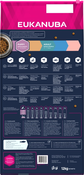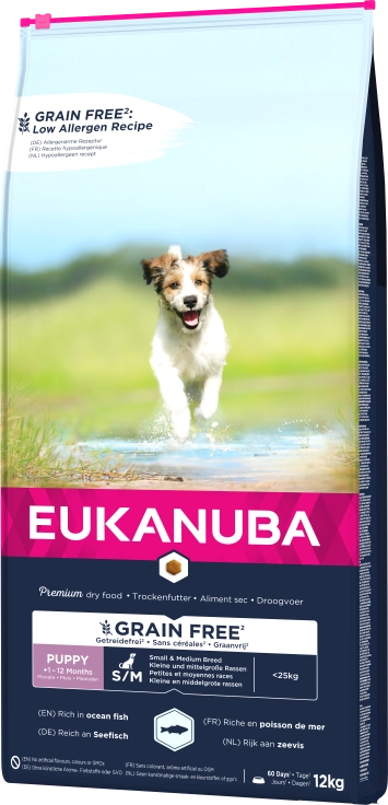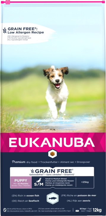 Eukanuba Puppy&Junior Small/Medium Grain Free Łosoś 12kg to karma stworzona z myślą o szczeniętach małych i średnich ras. Dzięki bezglutenowej formule, jest doskonałym rozwiązaniem dla psów z wrażliwym układem pokarmowym. Składniki karmy są starannie dobrane, aby nie zawierały powszechnie występujących alergenów, co ułatwia utrzymanie dobrego samopoczucia pupila.