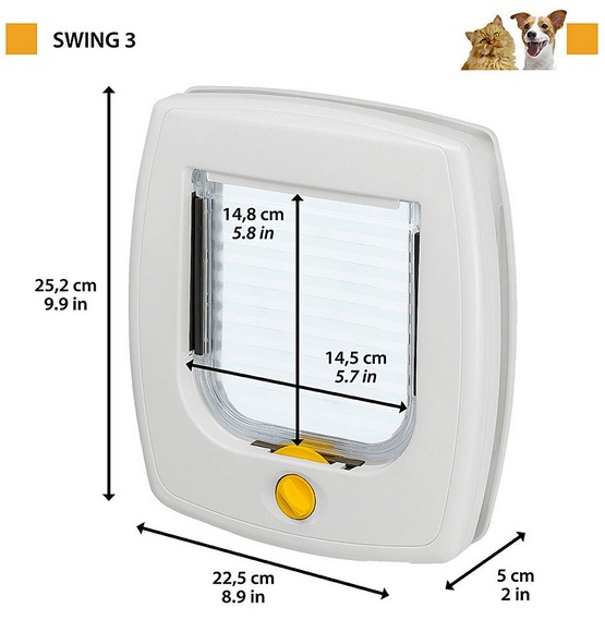 Model Swing 3 ma całkowity rozmiar drzwi wraz z oprawą wynoszący 22,5 x 5 x 25,2 cm. Rozmiar otworu wejściowego to 14,5 x 14,8 cm, co sprawia, że jest to idealny wybór dla małych czworonogów.