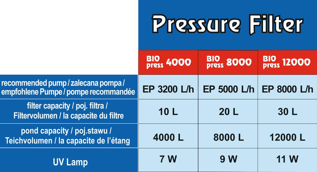 Filtr ciśnieniowy BIOpress 8000 to idealne rozwiązanie dla średnich oczek wodnych o pojemności do 8000 litrów. Zapewnia efektywną filtrację mechaniczną i biologiczną, co przyczynia się do czystości wody oraz zdrowego środowiska dla ryb i roślin.